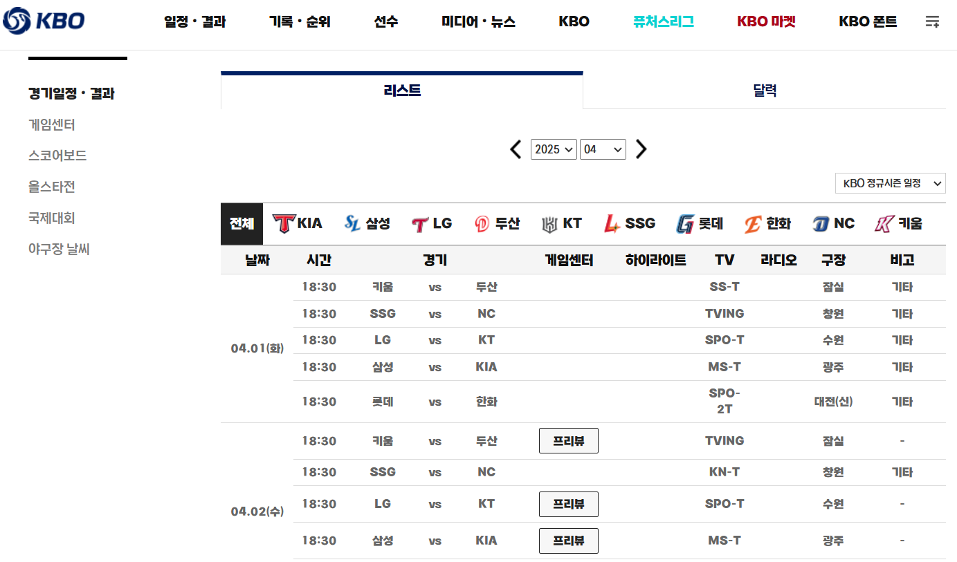 KBO 리그는 각 구단이 사용하는 공식 예매처가 다릅니다. 아래 표를 클릭하여 바로 예매하세요.