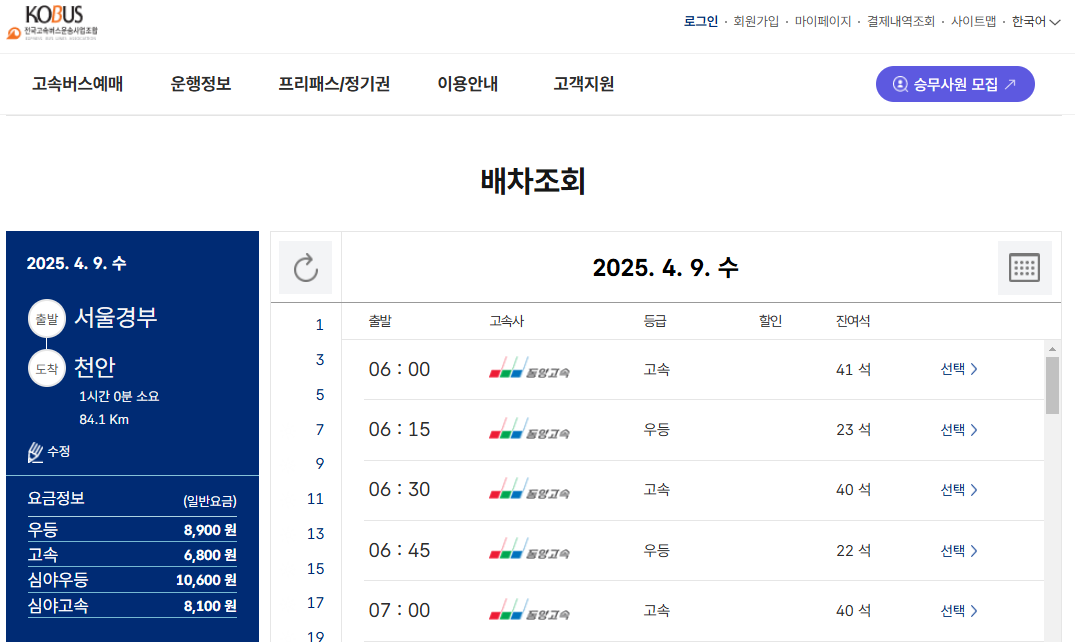 서울경부, 천안 노선 고속버스 예매하실때 아래['코버스(경부선)' 홈페이지] 링크 클릭하시면 됩니다.